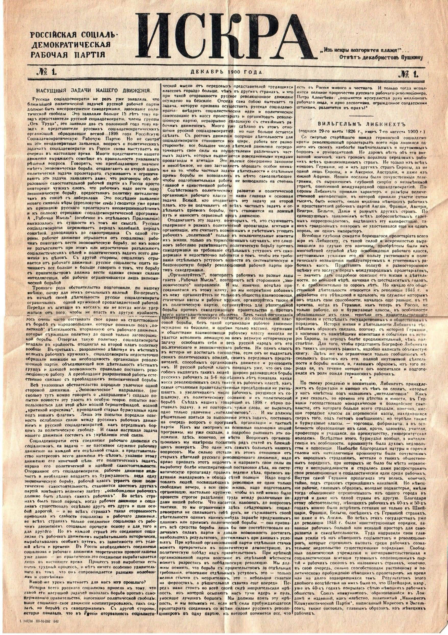 Partiji je bila potrebna točka okupljanja oko koje bi drugovi mogli organizirati kako svoju unutrašnju partijsku aktivnost, tako i vanjsku agitaciju i propagandu. S karakterističnim uvidom, Lenjin je predložio da se osnuje sve-ruski komunistički list kao sredstvo za ovu svrhu. „Iskra“ (Iskra), s uredničkim odborom u izgnanstvu, van domašaja carističke tajne policije, pružila je ovo centralno tijelo koje je radilo na ujedinjenju ruskih komunista.